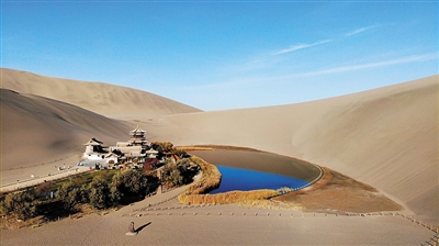 深秋时节,甘肃省敦煌市鸣沙山月牙泉景区被秋色渲染,风景如画,引人入胜。