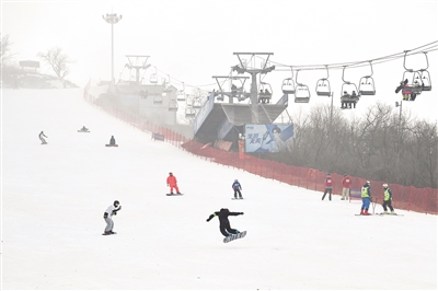 ▶ 11月11日,滑雪爱好者在庙香山滑雪场滑雪。