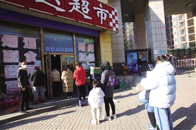 图为,平城区太安路一家超市外市民有序排队采购。