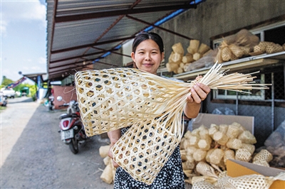 ▶ 11月9日,泰国清迈一家“插隆”工厂的工作人员向记者展示“插隆”。