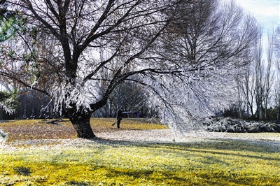 近日,文瀛湖生态公园对园内树木浇灌防冻水,确保树木安全越冬。这些树木经喷淋后形成雾凇,成为公园一景。 本报记者 张占兵 摄