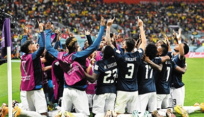 11月25日,厄瓜多尔队在比赛中庆祝进球。