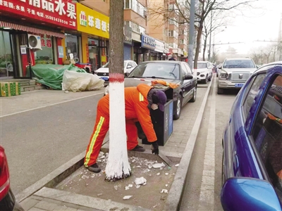 同时,环卫工人对人行便道、绿化带内垃圾进行捡拾,还对各路段人行道及地面泥点、积冰、污染物进行清理作业,做到垃圾随有随清。此外,环卫工人用玻璃水对果皮箱、过街天桥护栏、公交站台等进行擦拭,并进行了消杀,最大限度降低沙尘天气带来的影响。