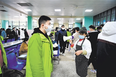 12月12日,在重庆市铁路中学校的食堂内,复课学生在食堂工作人员的引导下有序排队打饭。