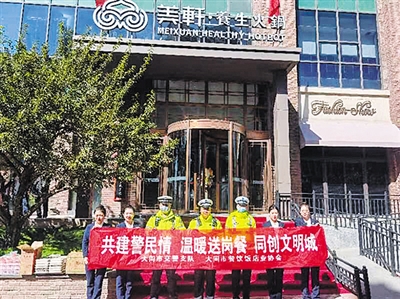 “警民共建餐饮文明街区”活动为餐企实实在在地解决了难题,受到众多餐企的好评,也让他们对交警工作的辛苦有了更深的了解。为了推动“警民共建餐饮文明街区”活动进一步深入开展,今年国庆假期,市餐饮饭店业协会继续组织我市餐饮企业开展“共建警民情,温暖送岗餐”活动,为坚守在一线的执勤交警送上爱心快餐盒饭,让他们能及时吃上热乎乎的饭菜。自去年以来,有40多家餐企参与其中,花园大饭店、弘雅饭店、尚品御泉、鼓楼东街老火锅、山西毅成(集团)管理有限公司、永和文瀛饭店等餐饮企业共为一线执勤交警送去快餐盒饭近600盒。