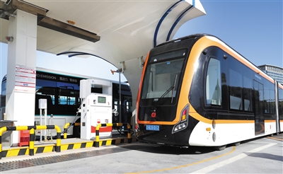 12月15日,一辆氢能中运量公交车驶入氢能公交车加气站加气。