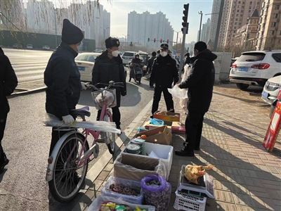 在平城区永和路,执法人员和社区工作人员沿路巡查发现,有的商户把货物堆在店门外,有的商户把餐厨垃圾桶摆在人行通道上,还有的商户门窗贴满了广告。执法人员对存在问题的商户进行劝导,协助商户搬回占道货物,清理门窗贴字和陈旧破损广告等,同时向经营者、游商游贩和群众进行法律法规宣传,营造“人人参与城市管理,城市管理人人受益”的良好氛围。