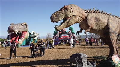 ▶ 12月18日,人们在美国加利福尼亚州洛杉矶县参观大型仿真恐龙展。