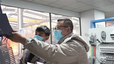 图为,该公司电气车间资深技工王晓春(右)运用“现场授课”“反向监督”等方式,为新上岗职工讲解专业知识。