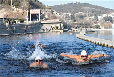 昨日,邯郸市峰峰矿区的冬泳爱好者在水中畅游。
