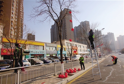 图为3日,工人们正在御河西路两侧树木上悬挂灯笼。