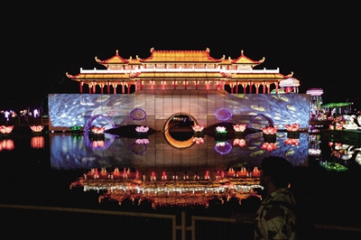 这是1月3日在智利首都圣地亚哥拍摄的成都廊桥造型的彩灯。