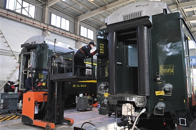 1月6日,在中国铁路太原局集团有限公司太原车辆段太原检修车间,工作人员在检查登顶作业装置。