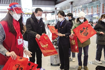 随着一副副春联新鲜出炉,把活动现场装扮得分外喜庆。散着墨香、透着喜庆的春联让旅客们纷纷停下脚步,驻足凝神,观赏书法家们笔走龙蛇。当天上午,书法家们现场创作了300余副春联,全部送到旅客手中。