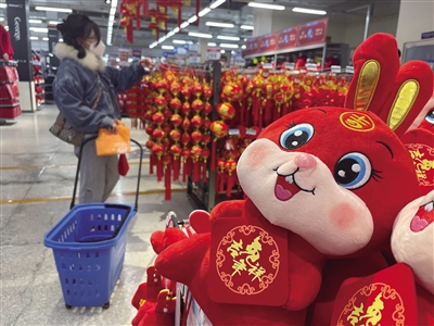 记者在西环路一家大型超市年货专区看到,一款品牌类零食大礼包,外包装是一个超大的萌兔简易袋,透明的塑料材质可直观看到内装的各种小包装零食,不少消费者认为口味多还实惠,纷纷装进购物车。同时,不少盒装饼干、巧克力和糖果等年货都摒弃了一贯的纸盒、铁盒包装,改换成红色萌兔色调的纸袋包装,受到消费者青睐。