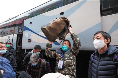 1月15日,专车抵达富顺县客运中心后,工作人员帮返乡农民工搬运行李。