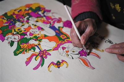 1月17日,在滩头镇福美祥年画作坊,年画艺人尹冬香在年画上加入手绘使年画更加灵动。