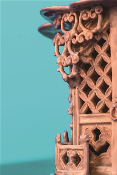 整件宝物呈宫殿造型,“宫殿”的门头与四角悬垂镂雕的如意云珠纹,四角垂饰连珠相结的璎珞纹,前后宫门门柱上各挂莲花铺首衔环,墙体为透雕的菱形,中部透雕云头纹;枕面为宫殿的殿顶,呈海棠曲线花瓣形,中心刻“卍”字锦纹,美轮美奂。在装饰技法上也有很大的创新,大量采用刻、划、剔、印、堆塑等技法,极大地丰富了瓷枕的表现力和艺术性,是一件集建筑与瓷塑艺术为一体的稀世珍品。