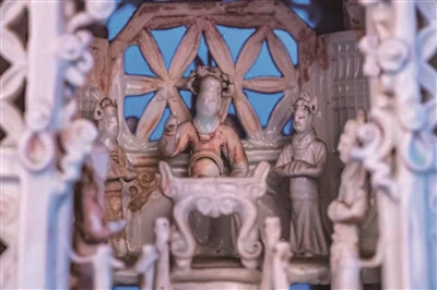 元代广寒宫影青釉瓷枕呈宫殿造型,四面镂雕故事。正面为广寒宫故事:嫦娥立于圆形的月宫内揽镜自顾,阶前玉兔双手执杵捣药。月宫内及台阶下各有两名侍者。背面为唐明皇游月宫的故事:中秋之夜,方士邀玄宗游月宫,掷手杖于空中,化为银色大桥。玄宗游“广寒清虚之府”,见仙女随音乐翩翩起舞,默默记下舞曲,这就是闻名后世的《霓裳羽衣曲》。左面为童子拜观音的故事:观音正在讲授知识,童子细心聆听。右面为道士拜北斗的故事:殿内一位道士正虔诚参拜,小徒儿捧着供品侍奉在侧,香炉正升着袅袅香烟……