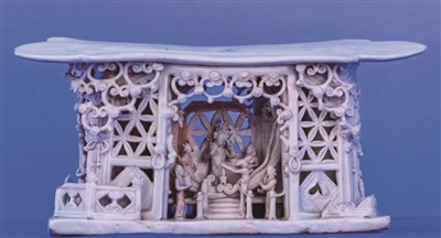 瓷枕始于隋代,唐代以后开始大量生产,并逐渐成为人们喜爱的床上枕具。元代广寒宫影青釉瓷枕1973年在大同市五里店出土,长32厘米、宽16厘米、高15.3厘米,为国内罕见的景德镇窑艺术珍品,它也是元代社会生产发展状况和历史风貌的反映,体现了元代制瓷工艺的辉煌成就。