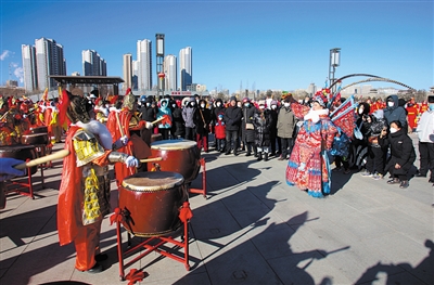 鼓棒上下飞舞,鼓手腾挪跳跃,在锣钹的伴奏下,鼓声时如雨打芭蕉,时如春雷初绽。铿锵有力的锣鼓声传递着群众对癸卯兔年的祝福和对美好生活的祈盼,人群中不时传出掌声、喝彩声,一派欢乐祥和的节日氛围。
