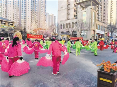 “咚咚锵、咚咚锵”……铿锵有力的锣鼓声、翩翩起舞的折扇、萌动可爱的大头娃娃、色彩鲜艳的服饰成为柳航里社区新春里一道靓丽的风景线。人们踏着初春的脚步,踩着欢快的鼓点,身着彩衣,载歌载舞,用令人振奋、欢腾热闹的秧歌由衷地抒发心中的喜悦和对生活的热爱,传递着对新春的美好祝福和憧憬,也展示了健康自信、积极向上的精神风貌,丰富了社区居民的文化生活。