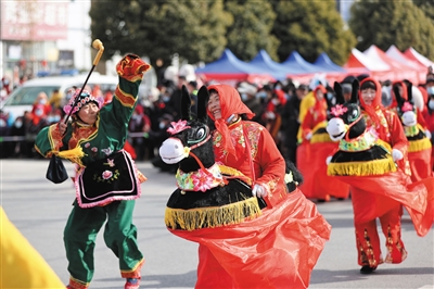 2月21日,在江苏连云港市赣榆区墩尚镇,人们在“二月二龙抬头”民俗表演活动中表演节目。