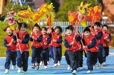 2月21日,浙江省湖州市长兴县夹浦镇中心幼儿园的孩子们体验舞龙。