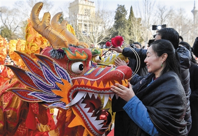 2月21日,在天津市水上公园,嘉宾为舞龙点睛。