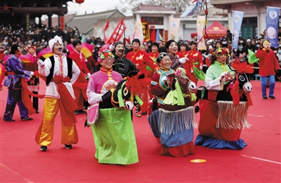 2月21日,在山西省临汾市襄汾县陶寺乡陶寺村,民间社火队在“二月二龙抬头社火节”活动中表演传统民俗“跑驴”。