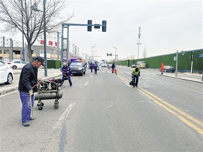 “窨井盖外围先用水泥填平,等气温回升后,再用沥青补好。”在文盛街云祥园小区门前,施工人员穿着安全标志服,设立醒目的安全警示标志,安排专人疏导交通,在保畅通、保安全的前提下,确保灌缝作业快速有序进行。