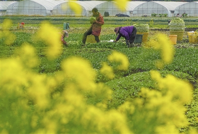 3月21日,在浙江省温州市瓯海区河头村,农民在采收蔬菜(无人机照片)。