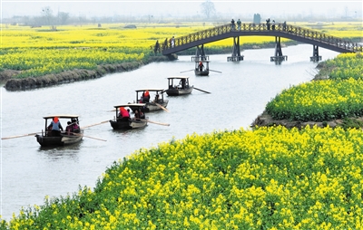 3月21日,游人在江苏省兴化市千垛菜花景区乘船游览(无人机照片)。
