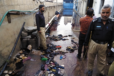 3月31日,在巴基斯坦卡拉奇,工作人员在踩踏事故现场工作。