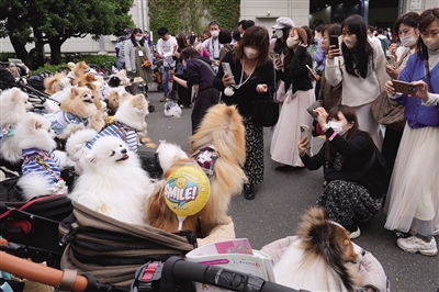 4月2日,人们在日本东京国际宠物用品博览会上为宠物拍照。