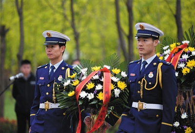 ▲4月4日,在陕西省兴平市烈士陵园,消防救援人员向烈士纪念碑敬献花篮。