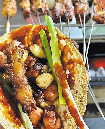 记者在采访中看到,因为店内的烧烤类都是七八成熟时上桌的,所以每桌都有一个独立的小烤架。上桌的菜品需要自己继续在小炉子上再烤一会儿,这就不仅让人们体验到了烧烤的乐趣,同时还不用让美味等太久。另外,自助干料干辣椒也有好几个辣度可以选择,想吃哪种弄哪种。吃的时候,取一张小饼折一下,蘸上烧烤酱和干料,卷上小葱、蔬菜,再把烤得冒油的肉串撸到饼内卷好,一份极具特色的淄博烧烤就完成了。如果你也想体验一下,就快去试试吧。 (孟维鹏)