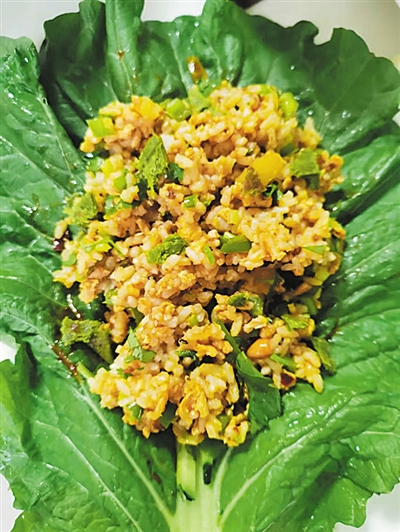 米饭焖好后,将焖得软烂的土豆压成泥,并将炒好的所有配菜放入,与米饭混合搅拌均匀。最后,准备长叶大生菜,将米饭包裹起来,东北菜包饭就做好了。别看它所用的材料非常简单,但是吃起来真的比肉还香。 (孟维鹏)