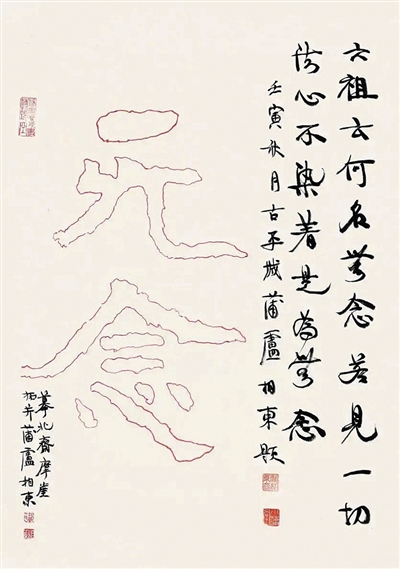 “俗话说‘三十而立’,举办个人展是对我近年来书法创作的阶段性总结,这也幸得我的老师李渊涛先生的悉心教导。”郝相东告诉记者,他与李渊涛相识于2015年,因为是书法界前辈,他把当时认为写得好的作品拿给先生看,先生肯定了他的学书天赋,但也指出要想走得长远,就一定得有自己的风格面貌。从此他暗下决心,在博涉众家的基础上,倾心于康有为碑帖融合、收放之间的书风,后来又发现颜真卿和康有为书法之间的联系,于是他思考如何能依托魏碑,把各类书体融会贯通,在古人影子中找自己,表达自己内心所想,进而达到意在笔端、随心而动之境界。