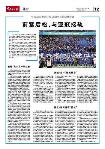 仅仅一天之后,中超官方公布了新赛季的具体赛程,从4月15日开始到11月4日结束,不到7个月的时间里,总共进行30轮共计240场比赛——在不少人还在感叹中国足协高层几乎被“团灭”、什么时候才能缓过一口气来的时候,2023赛季的中超联赛,随着武汉三镇在超级杯赛中战胜山东泰山并捧杯,不折腾,或者更确切地说,是已经折腾不起的中国足球新赛季,就这样悄然拉开了序幕。