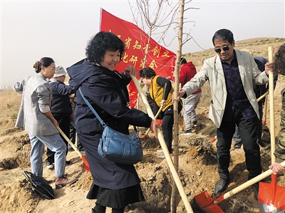 本报讯 (记者 尚铁军) 4月12日上午,在平城区马军营乡阳和坡村的山坡上,有一支打着小红旗的植树队伍特别引人注目。原来,这群头发花白的老人都是上世纪60年代末70年代初的知青,他们手拿铁锹,干劲十足地在这里植树。