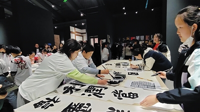 9日,学员们在云冈研究院金牌讲解员的带领下参观了云冈石窟,让他们对北魏文化与云冈碑刻题记有了更为直观的认识,同时也激发起更多的求知欲。研学者与云冈学研究专家、书法家们在石窟前坐而论道,讨论石窟艺术和魏碑书法,增加对家乡历史文化的了解。在书法互动区,参观了云冈博物馆展出的《鲁迅收藏佛教拓片艺术展》之后,孩子们挥毫泼墨,书写出一幅幅魏碑书法作品,收获满满。