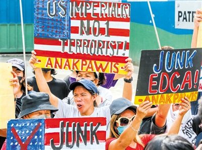 4月11日,在菲律宾首都大马尼拉地区奎松城,民众参加集会活动,抗议菲律宾和美国军方举行联合军事演习。