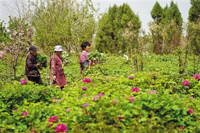 4月17日,河北省柏乡县十里铺村花农在牡丹种植园里运送刚刚采摘的牡丹鲜切花。