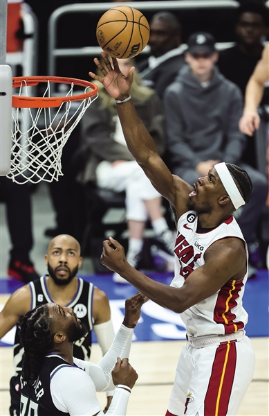 4月16日,在2022-2023赛季NBA季后赛首轮比赛中,迈阿密热火队客场以130∶117战胜密尔沃基雄鹿队。图为热火队球员巴特勒(右)在比赛中上篮。
