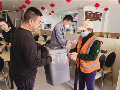 平城区环卫服务中心清洁一公司联合街道及综合行政执法队工作人员,在为沿街商户免费配发垃圾桶的同时,耐心向商户说明有效利用小垃圾桶对提升市容市貌和营商环境的意义,倡导商户自觉维护环境卫生,垃圾桶满溢后及时倒入沿街配套的垃圾收集桶或定时上门的垃圾收集车内,做到垃圾不隔夜、不落地。当天,工作人员共向商户配发垃圾桶100个。