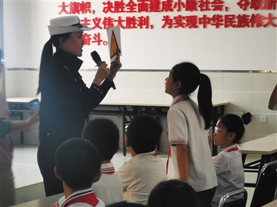 19日,平城区大庆路社区联合市交警二大队民警走进平城区实验小学,引导孩子们树立遵守交规的安全意识,掌握“知危险会避险”能力。 本报记者 杨翠叶
