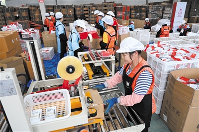 4月19日,在全国农村创业园区(基地)——宁德辰颐严选产业园的电商农产品深精加工车间,员工在包装准备发往全国各地的农产品。