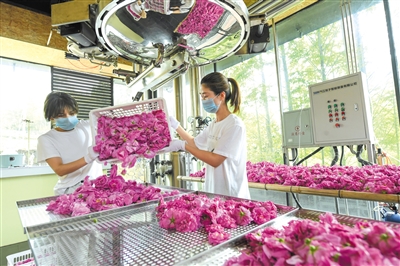 4月20日,工作人员处理刚采摘的玫瑰花,准备烘干。