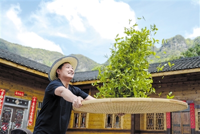4月19日,重庆市南川区德隆镇茶树村一个居民点,制茶工艺传承人吴科在帮助村民翻晒新鲜茶叶。